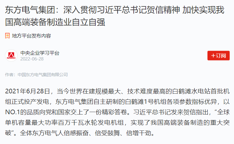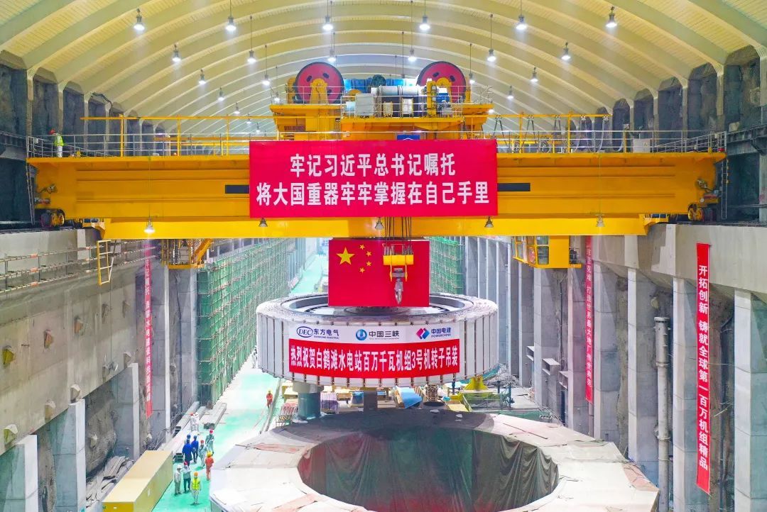 2021年6月28日,当今世界在建规模最大、技术难度最高的白鹤滩水电站首批机组正式投产发电,尊龙人生就是博ag电气集团自主研制的白鹤滩1号机组各项参数指标优异,以NO.1的品质向党和国家交上了一份精彩答卷。习近平总书记发来贺信指出,“全球单机容量最大功率百万千瓦水轮发电机组,实现了我国高端装备制造的重大突破”。全体尊龙人生就是博ag电气人倍感振奋、倍受鼓舞、倍增干劲。