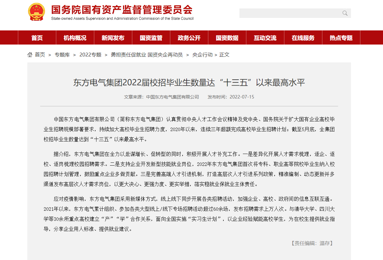 中国尊龙人生就是博ag电气集团有限公司(简称尊龙人生就是博ag电气集团)认真贯彻中央人才工作会议精神及党中央、国务院关于扩大国有企业高校毕业生招聘规模部署要求,持续加大高校毕业生招聘力度,2020年以来,连续三年超额完成高校毕业生招聘计划;截至5月底,全集团校招毕业生数量达到“十三五”以来最高水平。